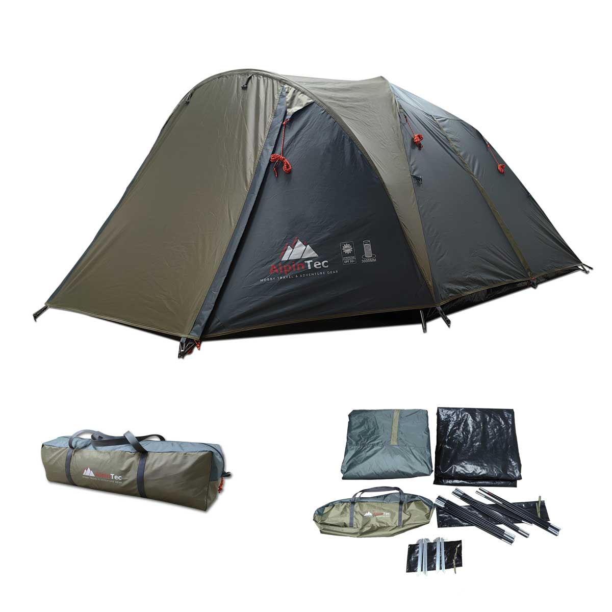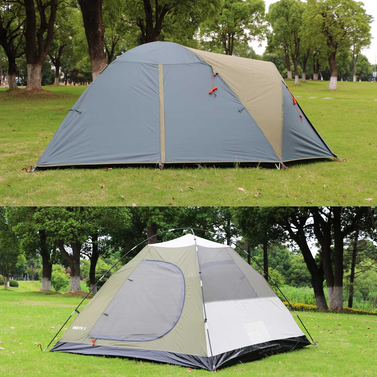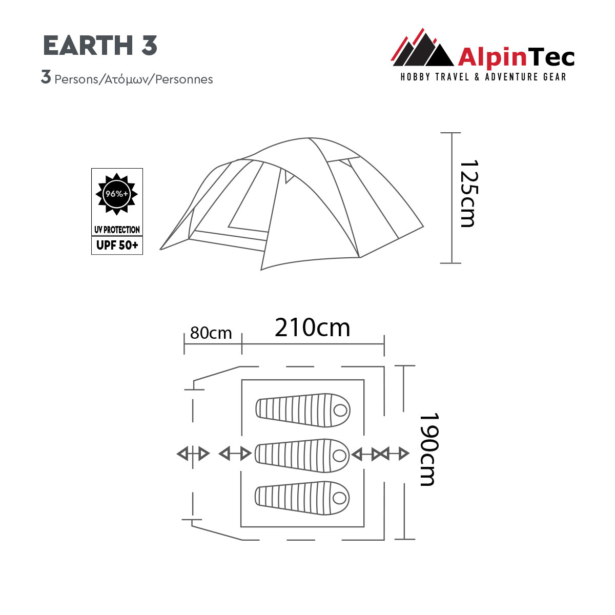 Ελαφριά σκηνή camping 3 ατόμων, ιδανική για εκδρομές με μεγάλους χώρους και αποθηκευτικό χώρο. Η σκηνή Earth 3 είναι κατασκευασμένη από διαπνέον ύφασμα με σίτα, αδιάβροχο εξωτερικό πανί έως 3000mm, ενώ το πάτωμα σκηνής είναι από polyethylene αδιάβροχο έως 10000mm. Τα υφάσματα είναι ειδικά επεξεργασμένα με επιβραδυντικό φλόγας και ο σκελετός είναι από μπανέλες Fiberglass. Διαθέτει δυο πόρτες με σίτα και υπάρχει εξαερισμός από όλες τις πλευρές της σκηνής για την καλύτερη κυκλοφορία του αέρα. Οι εσωτερικές τσέπες και ο επιπλέον αποθηκευτικός στην οροφή εξυπηρετούν τις ανάγκες σας, για αποθήκευση μικροαντικειμένων (είδη κάμπινγκ, γυαλιά ηλίου, φακό κεφαλής, κλπ). Στη συσκευασία περιλαμβάνεται σάκος μεταφοράς και αποθήκευσης, ανακλαστικά σχοινιά εγκατάστασης και πασαλάκια.